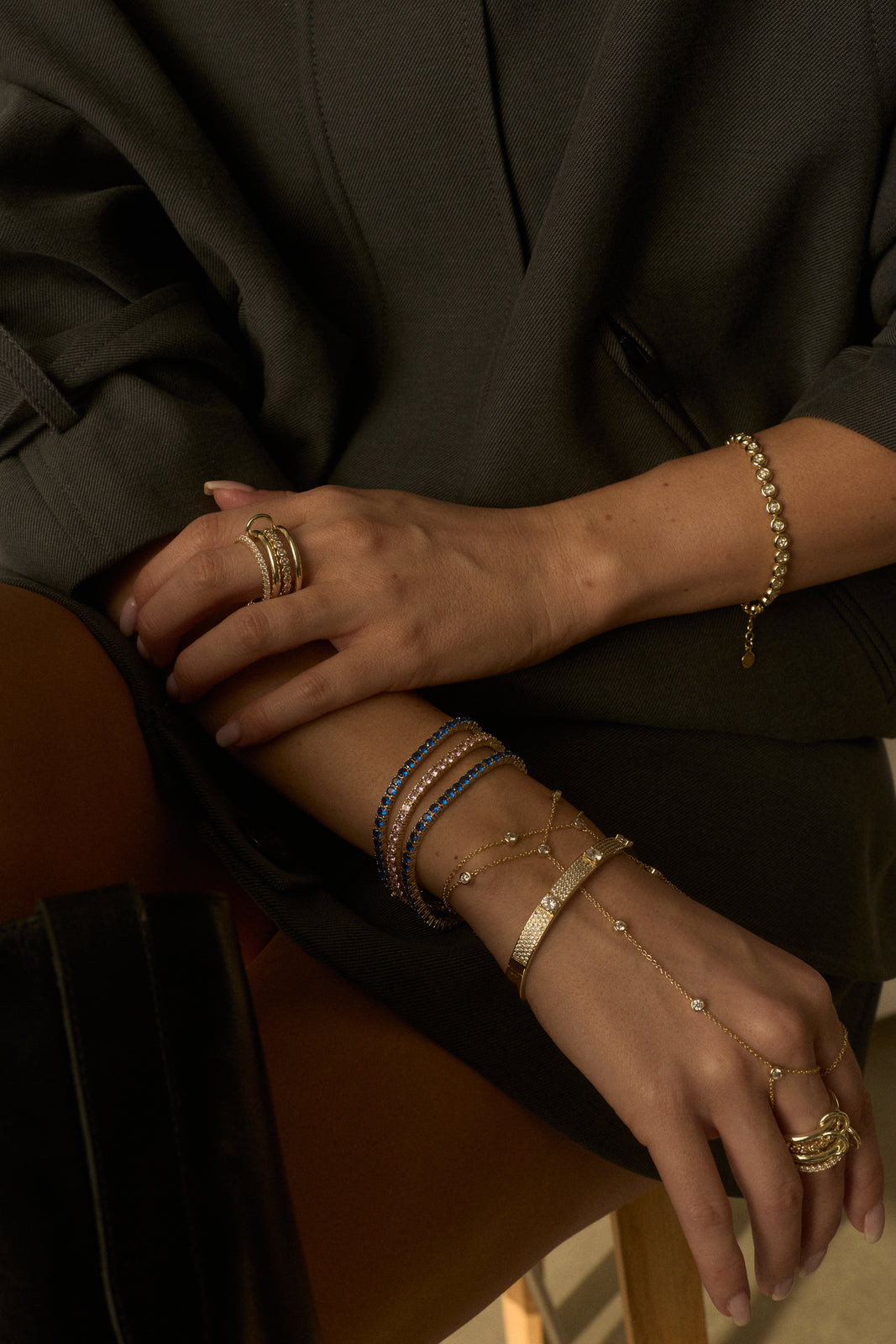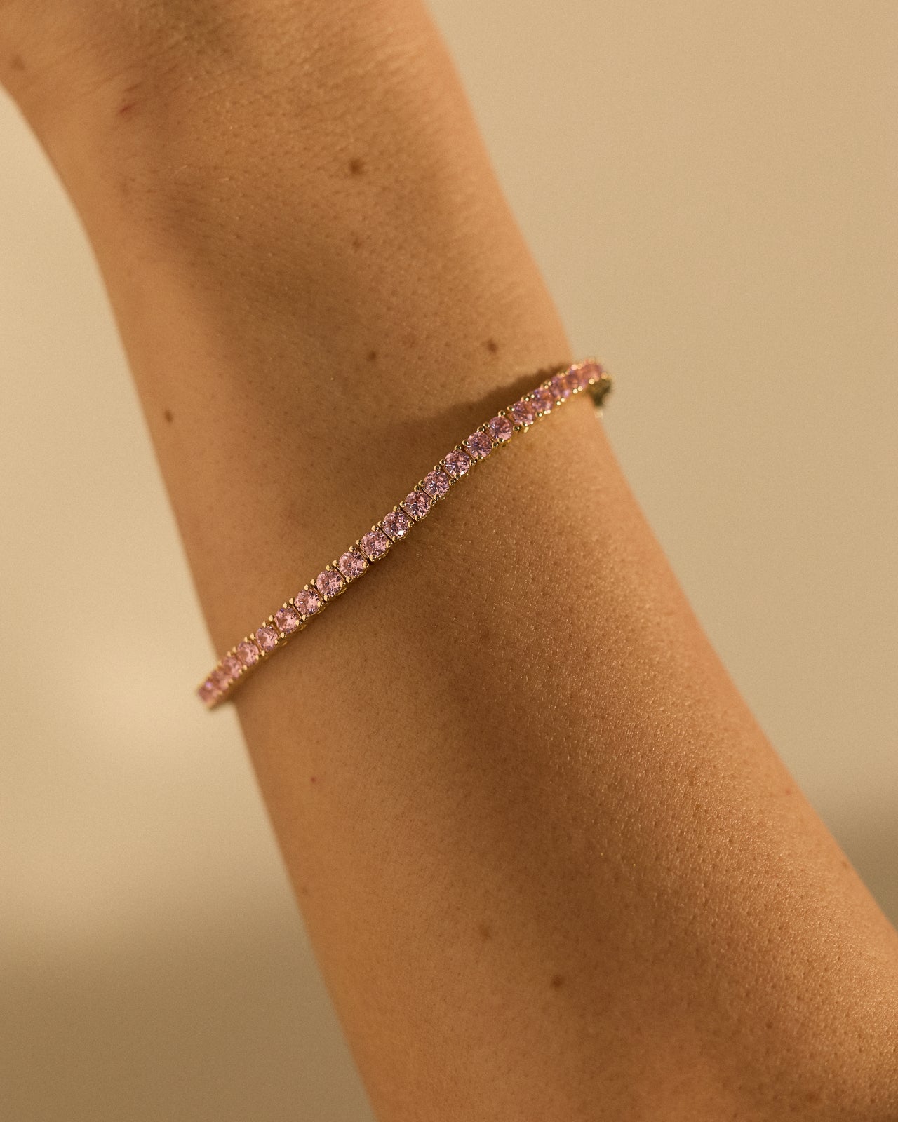 Our new elevated baby pink tennis bracelet with box clasp in grade A cubic zirconia for extra sparkle. 3mm stones. A perfect bracelet to wear time and time again. This is a classic which you will love for years to come.