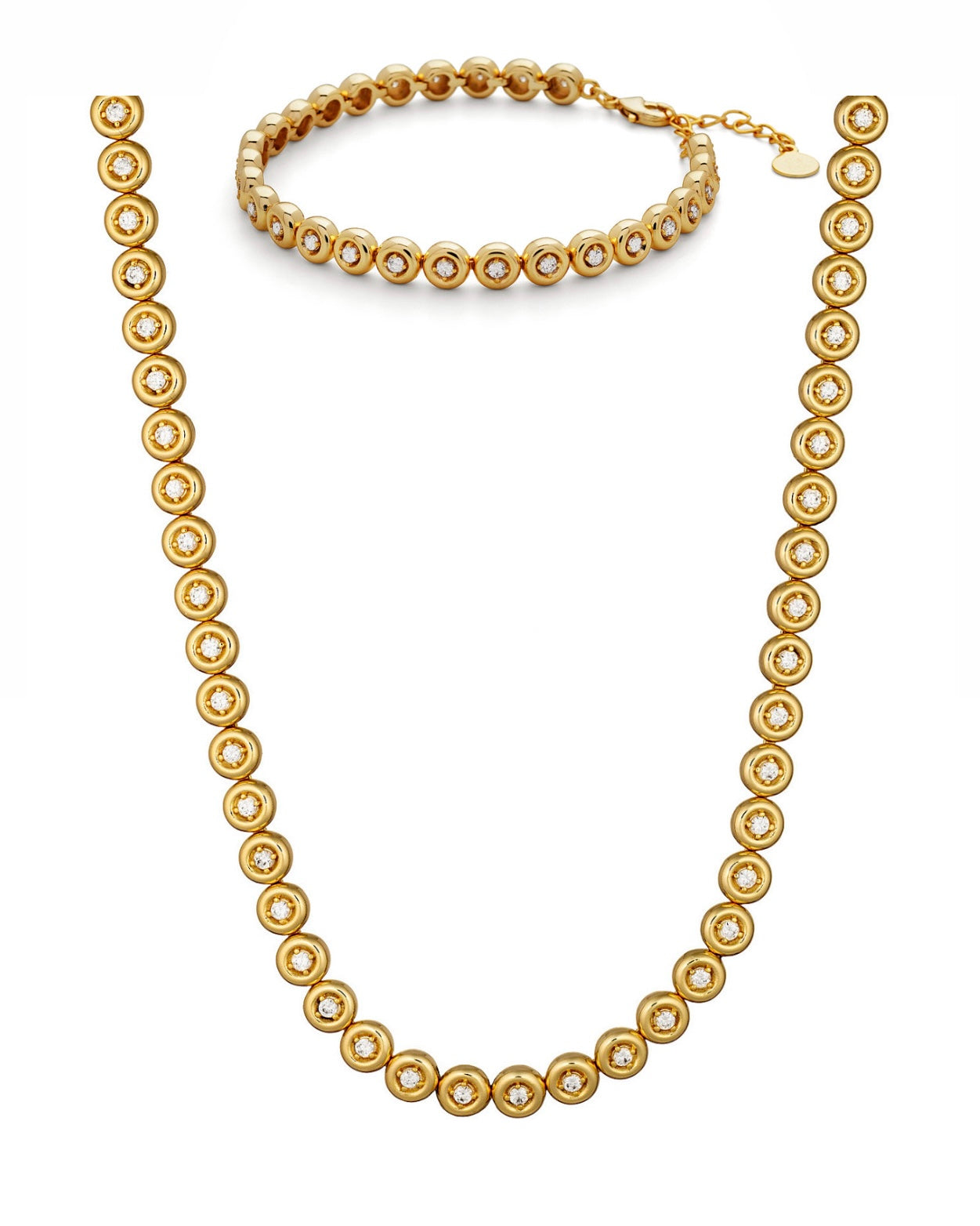 Crafted in a heavy 2 micron 14ct gold plating over brass, our prettiest orb set crystal tennis necklace & bracelet set will elevate your wardrobe for years to come.