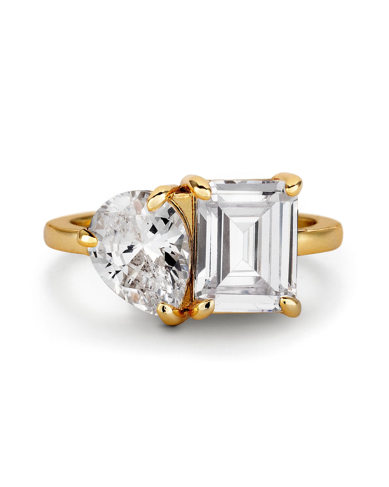 Our favourite new Double Stone Ring features a striking contrast of two statement stones. A modern emerald-cut crystal set beside a delicate pear shaped stone, both nestled in a gorgeous 14ct gold plated band.